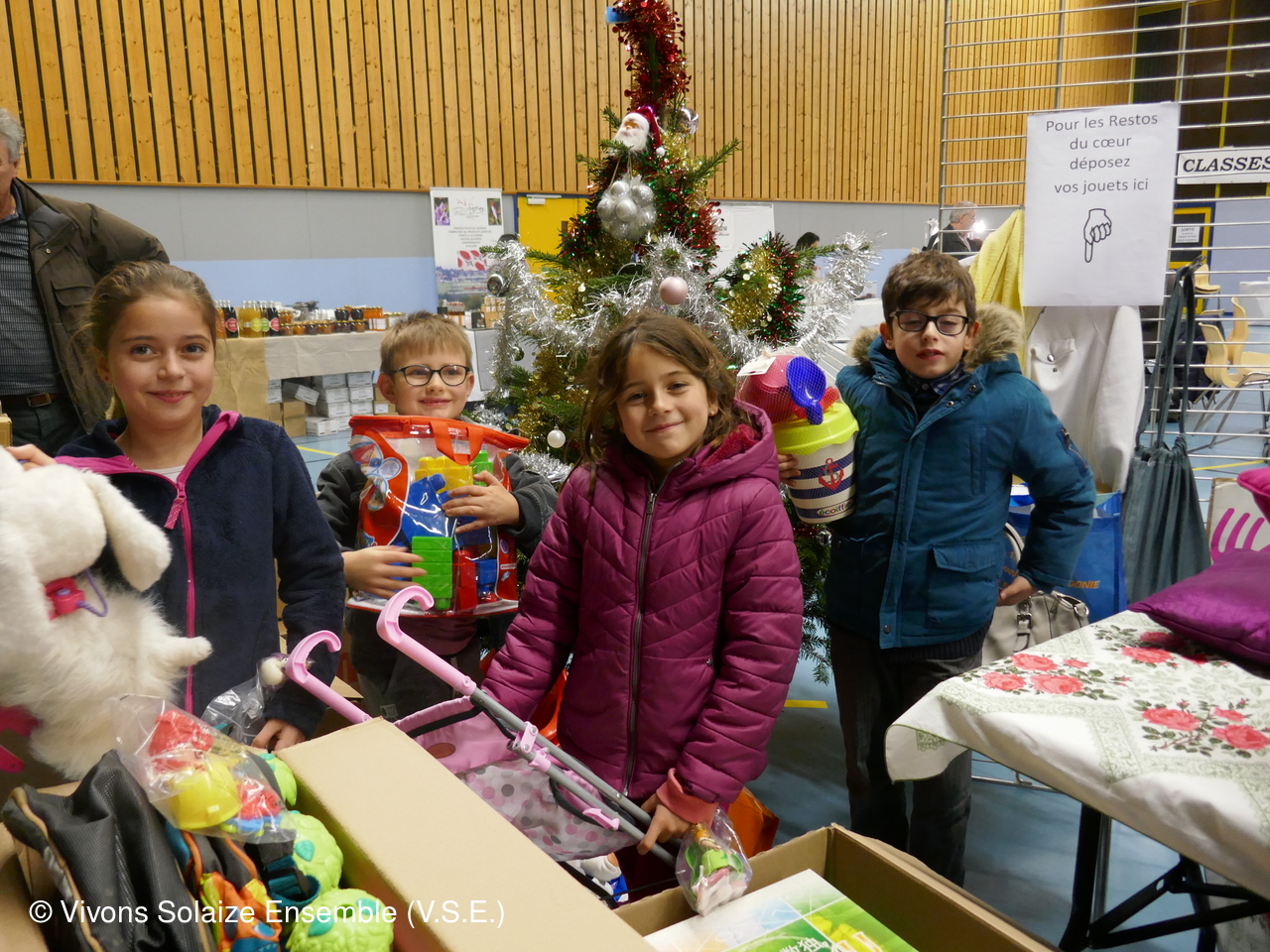 Comme depuis la création de notre manifestation, nous associons les "Restos du Coeur" à cette journée consacrée aux enfants. Les jouets non vendus sont, pour une part non négligeable, cédés aux "Restos du Coeur" par les participants.